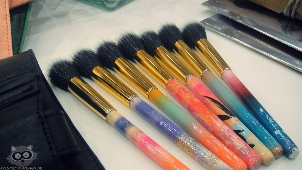 Was mich magisch anzog: die vielen toll gestalteten Pinsel von JACKS beauty line. Die Pinsel wurden alle von Miriam Jacks (eine bekannte Make-up Artist) persönlich entworfen, wobei sie die Stiele der Pinsel per Hand fertigt. Die Stiele bestehen aus recycelten Holz und werden mit Acryl-Farbe besprenkelt. Leider leider sind nicht alle Pinsel synthetisch. Aber die nette Dame am JACKS Stand gab mir Auskunft über die veganen Pinsel in der Kollektion. Eyeliner Brush, Small Angled Brush, Mineral Powder Brush sowie Foundation Brush sind somit vegan. Leider war die Auskunft etwas verwirrend, sodass ich auch hier nochmal selbst recherchieren musste. Für mich definitiv bedauerlich, dass ich oft erleben musste wie die Leute nicht über die Inhaltsstoffe ihrer Produkte Bescheid wussten.