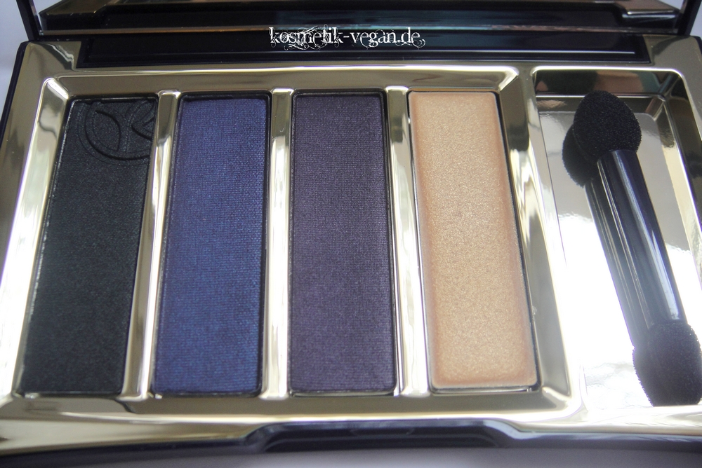 Yves Rocher verwendet in den Produkten eher selten tierische Inhaltsstoffe, weshalb ich erstmal von veganen Lidschatten ausging. Ein paar Tage wartete ich noch mit dem Ausprobieren, denn vorab musste ich schließlich Fotos von der unberührten Palette schießen. Ähnlich lange dauerte auch die Antwort von YR bezüglich der Inhaltsstoffe. Als ich dann eines morgens endlich zum Testen kam, sah ich erst, dass der goldene „Lidschatten“ eigentlich eine Art Gel-Eyeliner ist. Von YR als Highlighter beschrieben. Jetzt ahnte ich schon, dass da wohl Bienenwachs drin sein würde und prompt bekam ich die ernüchternde Email zu meiner Vermutung. Im goldenen Eyeliner ist Bienenwachs aus nicht kontrolliert biologischem „Anbau“. Jetzt hatte ich die Fotos schon alle im Kasten und bin auch wirklich sehr begeistert von den Lidschattenfarben. Der Eyeliner ist mir Schnuppe. Nachdem ich ein paar Freunde (u.A. auch Veganer) um Rat fragte, überzeugten sie mich davon die Palette dennoch auf Blanc et Noir vorzustellen. Ich weiss ja, dass hier auch viele nicht vegan lebende Menschen mitlesen, aber so ganz wohl ist mir mit der Sache nach wie vor nicht. Ich will doch nicht meine veganen Superkräfte verlieren. :) Frei nach „Scott Pilgrim„. Die Palette ist also nicht vegan, wegen des Bienenwachses im Eyeliner. Die Lidschatten als solche sind aber frei von tierischen Inhaltsstoffen.